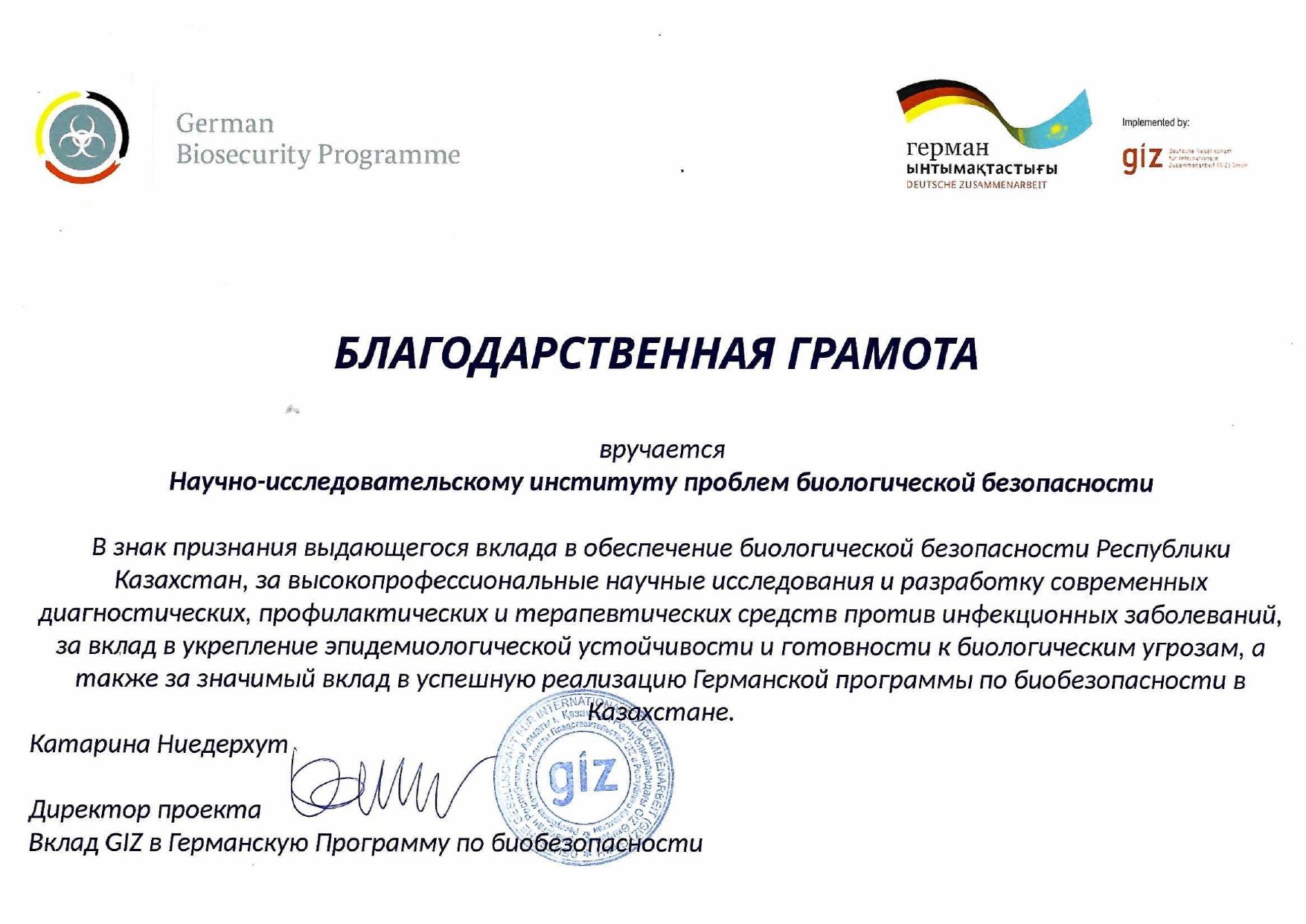 Жобаның аяқталуына байланысты биоқауіпсіздік бойынша Германдық бағдарлама жұмысының қорытындысы шығарылды. Бағдарламаны іске асыру барысында Қазақстан Республикасының биологиялық қауіпсіздігін нығайтуға бағытталған көптеген бастамалар орындалды. GIZ биоқауіпсіздік және патогендердің таралуын болдырмау саласындағы құзыреттерін дамыта отырып, халықаралық стандарттарды енгізуді және жас ғалымдарды қолдауды белсенді түрде алға тартты. Бірлескен жұмысқа қатысқан Институт Қазақстанның биологиялық қауіпсіздігін қамтамасыз етуге қосқан елеулі үлесі үшін алғыс хатпен марапатталды.